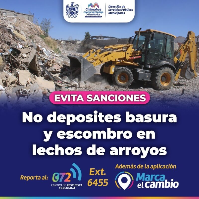 H. Ciudad de Chihuahua, Chih. A 26 de agosto de 2025.- Con el objetivo de mantener una buena imagen urbana, el Gobierno Municipal a través de la Dirección de Servicios Públicos Municipales, invita a la población a evitar tirar basura o escombro en lechos de arroyos.