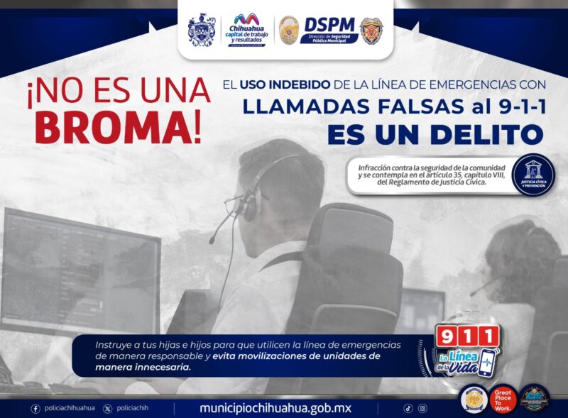Chihuahua, Chih., a 20 de enero de 2025.- El Gobierno Municipal, a través de la Dirección de Seguridad Pública Municipal (DSPM), exhorta a la ciudadanía a no realizar llamadas falsas al 9-1-1, para evitar movilizaciones innecesarias de policías o bomberos, ya que pudieran ser necesitados en situaciones reales.