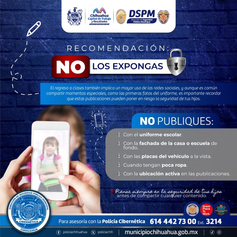 H. Ciudad de Chihuahua, Chih. A 29 de agosto de 2025.- La Dirección de Seguridad Pública Municipal a través de la Policía Cibernética, hace un llamado a la ciudadanía a evitar exponer a sus hijos este regreso a clases en fotografías publicadas en redes sociales, ya que, aunque compartir imágenes pueda parecer inofensivo, también puede poner en riesgo su seguridad y privacidad y exponiéndolos a ser víctima de algún delito.