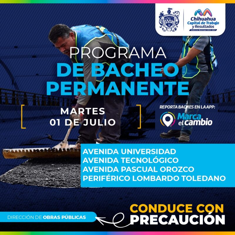 H. Ciudad de Chihuahua, Chih., A 01 de julio del 2025.- El Gobierno Municipal, por medio de la Dirección de Obras Públicas, trabajará con bacheo en zonas prioritarias de la ciudad, cubriendo provisionalmente con material fresado, ya que, debido a la presencia de agua y humedad en las avenidas, no es posible realizar el proceso de bacheo tradicional con mezcla asfáltica cliente.