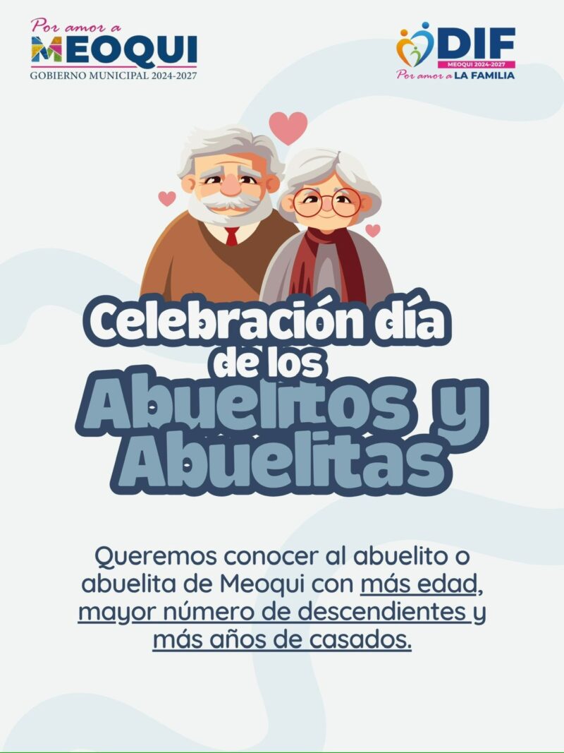 En Meoqui se encuentra abierta la convocatoria para dar reconocimiento a las y los abuelitos más longevos, con más descendencia y con más años de casados, donde los ganadores, recibirían premios en efectivo y reconocimientos, esto como parte de los festejos por el Día del Abuelo y la Abuela, próximos a realizarse este 27 de agosto.