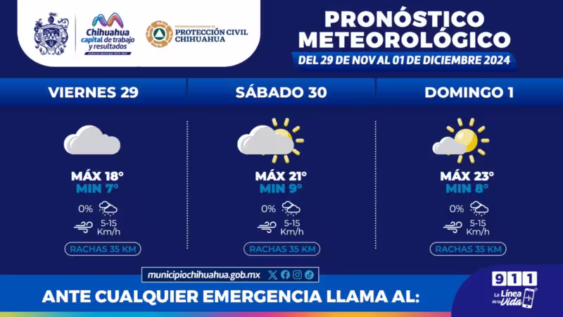 Chihuahua, Chih. A 29 de noviembre del 2024.- La Coordinación Municipal de Protección Civil, informa que este fin de semana, del 29 de noviembre al 1 de diciembre, se prevén temperaturas máximas de 23°C y mínimas de 7°C.