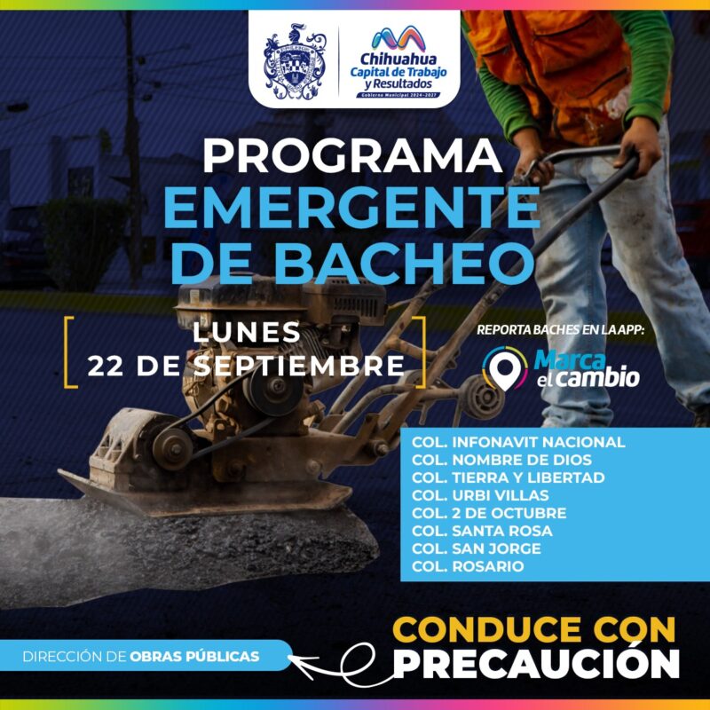 H. Ciudad de Chihuahua, Chih., a 22 de septiembre del 2025 .- El Gobierno Municipal, a través de la Dirección de Obras Públicas realizará trabajos de bacheo mediante el programa emergente en las colonias: Infonavit Nacional, Nombre de Dios, Tierra y Libertad, Urbi Villas, 2 de Octubre, Santa Rosa, San Jorge y Rosario.