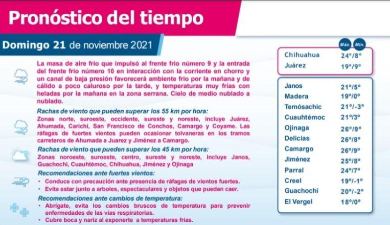 Adicionalmente, existe la posibilidad de que se registren vientos que pueden superar los 45 kilómetros por hora en las zonas noroeste, suroeste, centro, sureste y noreste, incluidos Janos, Guachochi, Cuauhtémoc, Chihuahua, Jiménez y Ojinaga.