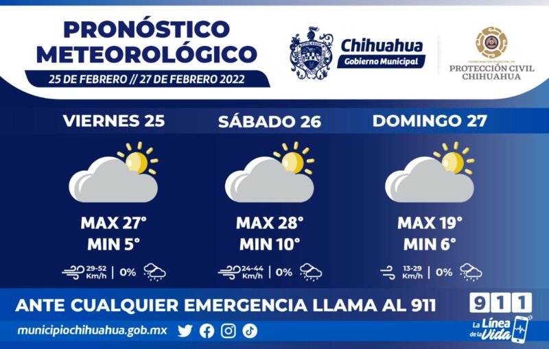 Con clima templado durante el día, noches y mañanas frescas, así como vientos menores de 52 kilómetros por hora es el pronóstico para este fin de semana que da a conocer la Coordinación Municipal de Protección Civil, de acuerdo al Servicio Meteorológico Nacional.