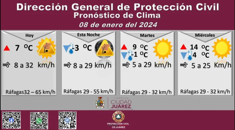 Para mañana martes se esperan fuertes ráfagas de viento que llegarán los 32 kilómetros por hora, la temperatura máxima se pronostica en los 9 °C, mientras que la mínima será de -1 °C, la velocidad del viento oscilará de 5 a 29 kilómetros por hora.