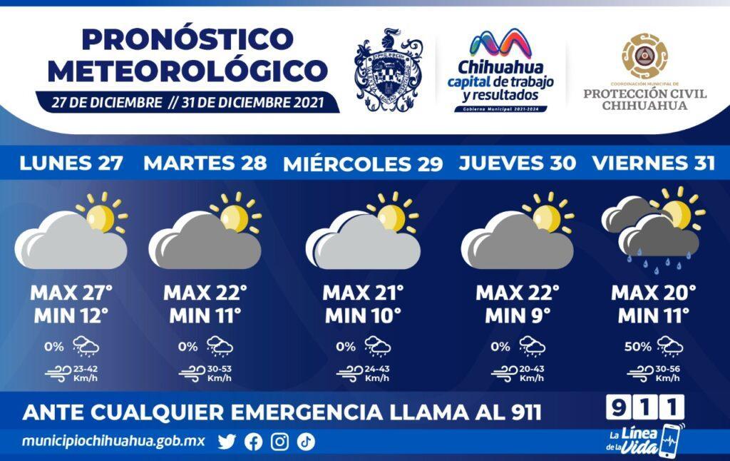 La Coordinación Municipal de Protección Civil, pronostica una semana ventosa y con cielos mayormente nublados en la ciudad de Chihuahua, de acuerdo al pronóstico que emite el Servicio Meteorológico Nacional de CONAGUA, por lo cual se invita a la ciudadanía tomar las debidas precauciones ante los cambios climáticos.