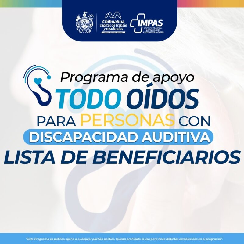H. Ciudad de Chihuahua, Chih., a 28 de mayo de 2025.- El Gobierno Municipal, a través del Instituto Municipal de Prevención y Atención a la Salud (IMPAS), da conocer los beneficiaros de 70 aparatos auditivos que se entregarán como parte del programa “Todo Oídos” edición 2025.