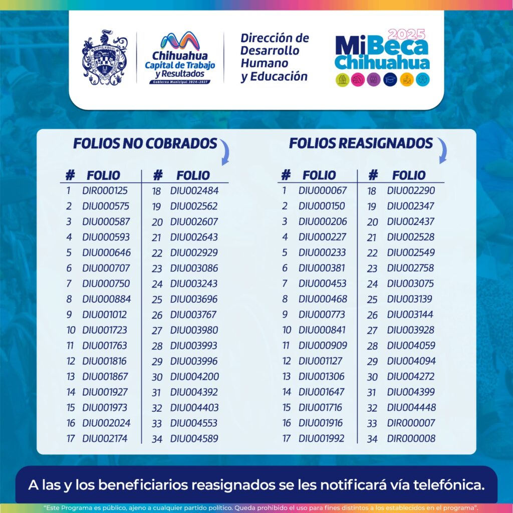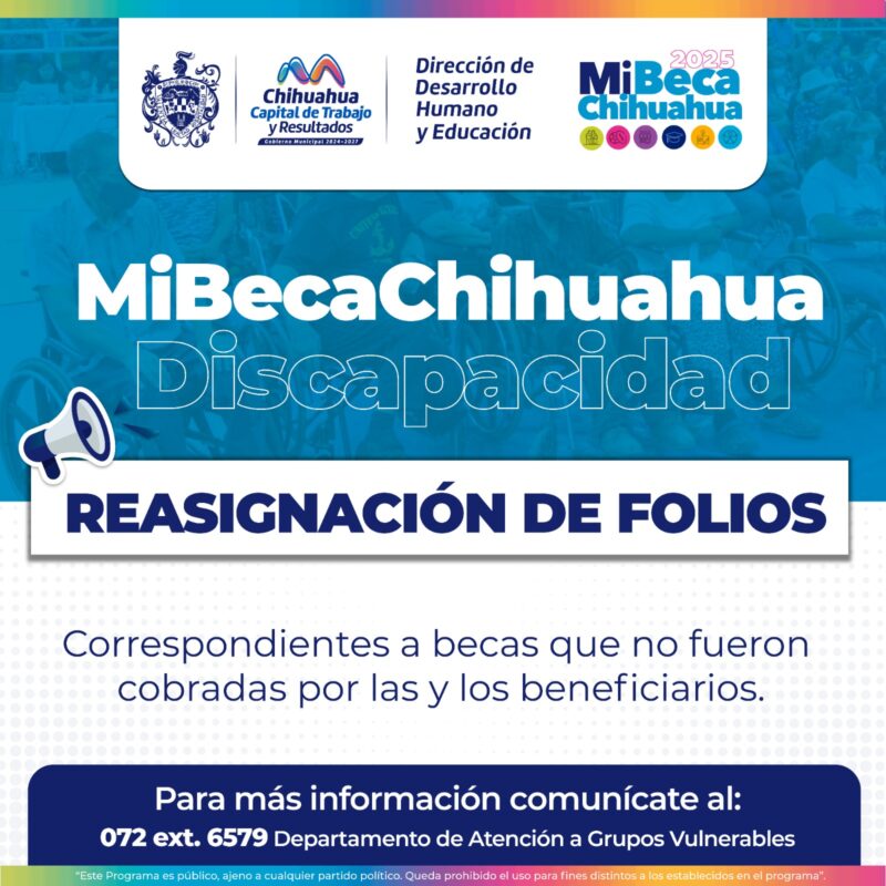 H. Ciudad de Chihuahua, Chih., a 27 de julio de 2025.- El Gobierno Municipal, a través de la Dirección de Desarrollo Humano y Educación, informa que durante la tercera sesión ordinaria del Comité de Validación del Programa de Becas para el Desarrollo Humano de Personas con Discapacidad 2025, se autorizó la reasignación de folios correspondientes a becas que NO fueron cobradas por los beneficiarios.