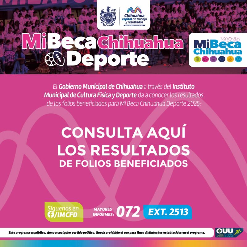 A través de la página oficial del Municipio de Chihuahua https://www.municipiochihuahua.gob.mx/CCS/Convocatorias, podrán consultar los folios de los beneficiarios en las categorías atletas menores y mayores de edad, deporte adaptado, alto rendimiento, entrenadores, promotores en canchas municipales y ganadores del Premio Teporaca.