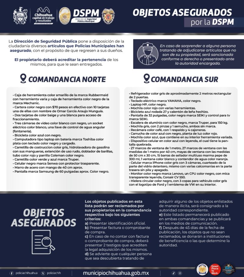 Chihuahua, Chih., a 17 de enero de 2025.- La Dirección de Seguridad Pública Municipal (DSPM) publicó en ambas comandancias, la lista de objetos asegurados pertenecientes a ciudadanos que hayan sido robados o extraviados en los últimos meses, mismos que pueden ser reclamados por los propietarios siempre y cuando se compruebe la legal pertenencia.