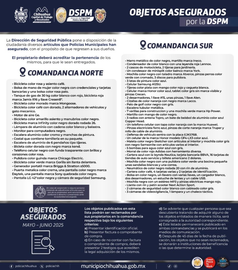 H. Chihuahua, Chih., 10 de julio de 2025.- Como parte de la política de transparencia de la actual administración municipal, la Dirección de Seguridad Pública (DSPM) pone a disposición de sus dueños el listado de artículos recuperados por agentes municipales durante los meses de mayo y junio del presente año, los cuales estarán disponibles en el área de Evidencias de las comandancias Norte y Sur.