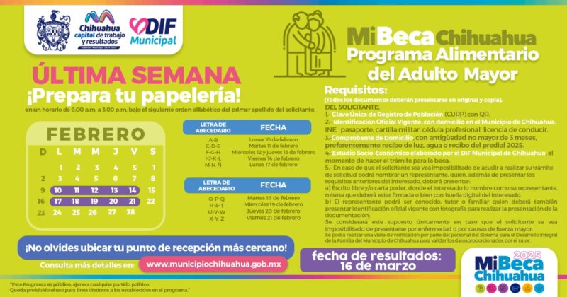 Chihuahua, Chih., a 16 de febrero de 2025.- El Gobierno Municipal, a través del DIF, informa que este viernes 21 de febrero cierra el proceso de recepción de documentos para el Programa Alimentario del Adulto Mayor (PAAM) edición 2025, por lo que invitan a continuar con el registro para no perderse la oportunidad de ser parte de este apoyo que brinda el Municipio.