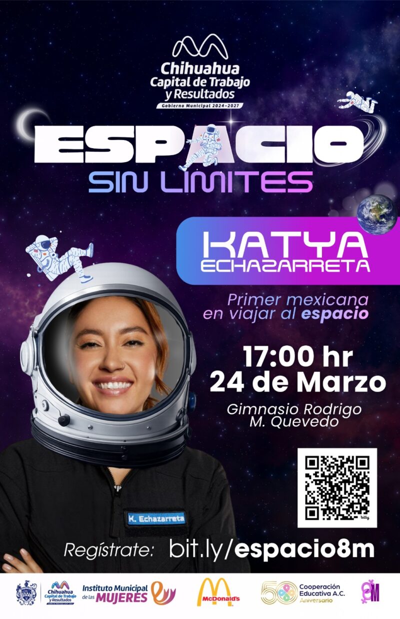 H. Ciudad de Chihuahua, Chih., a 20 de marzo de 2026.- En el marco del Día Internacional de la Mujer, el Gobierno Municipal de Chihuahua, a través del Instituto Municipal de las Mujeres (IMM), invita a la conferencia “Espacio sin Límites”, impartida por Katya Echazarreta, primera mujer mexicana en viajar al espacio.