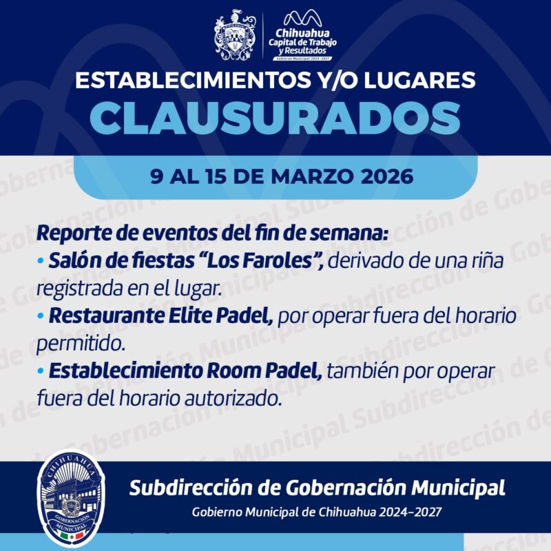 H. Ciudad de Chihuahua, Chih., a 16 de marzo de 2026.- El Gobierno Municipal de Chihuahua, a través de la Subdirección de Gobernación Municipal, informa el reporte semanal de las acciones de supervisión e inspección realizadas en distintos establecimientos de la ciudad.