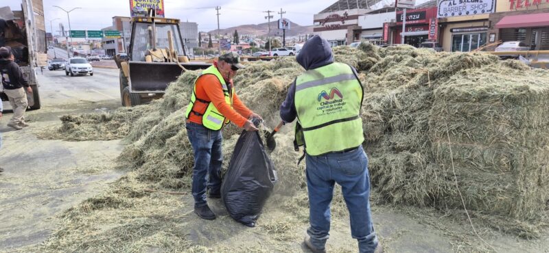H. Ciudad de Chihuahua, Chih. A 16 de mayo de 2025.- El Gobierno Municipal, a través de la de Dirección de Mantenimiento Urbano realiza acciones de limpieza en Periférico de la Juventud antes de llegar al cruce de la avenida Homero, tras el accidente de un tráiler que trasladaba pacas de pastura.