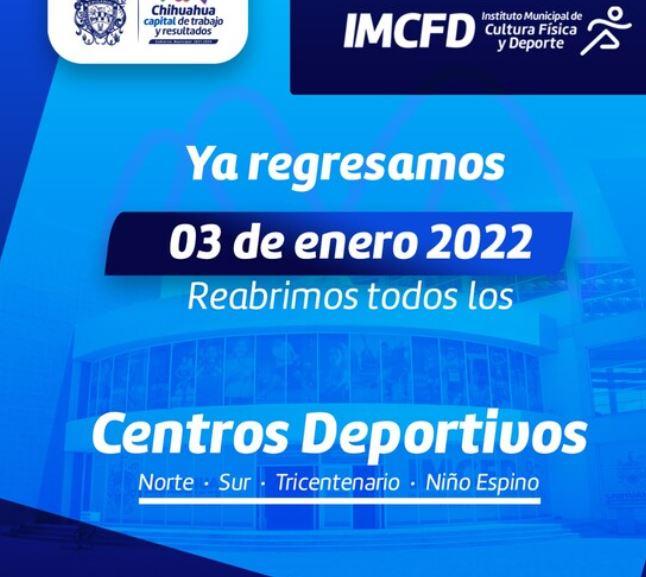 El Gobierno Municipal de Chihuahua, a través del Instituto Municipal de Cultura Física y Deporte (IMCFD), informa que se reanudarán este próximo lunes 3 de enero los servicios y clases de natación, yoga, boxeo, básquetbol y demás disciplinas que se ofrecen a través de los cuatro centros deportivos municipales, por cierre del periodo decembrino.