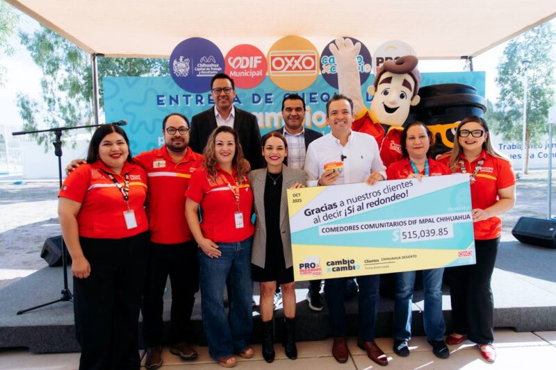 H. Ciudad de Chihuahua, Chih., a 24 de octubre de 2025.- El alcalde Marco Bonilla y la presidenta del DIF Municipal, Karina Olivas, recibieron de la cadena comercial OXXO un cheque por 515 mil 39 pesos, producto del redondeo “Cambio x Cambio” realizado durante tres meses en más de 300 tiendas de la plaza Chihuahua Desierto, cuyos fondos se destinarán a fortalecer los comedores comunitarios del DIF Municipal.