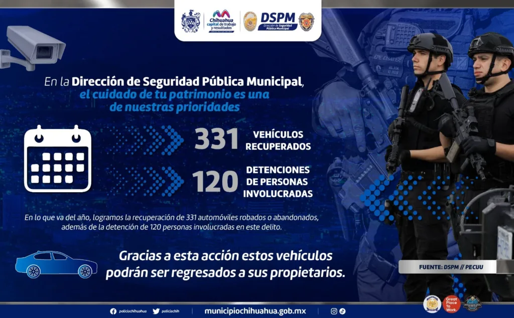 Gracias a los constantes operativos y recorridos de vigilancia que realiza la Policía Municipal en la ciudad y en la zona rural del municipio de Chihuahua, en lo que va del año, los elementos lograron la recuperación de 331 automóviles que contaban con reporte de robo o fueron abandonados, además de asegurar a 120 personas involucradas en este delito, que afecta principalmente el patrimonio de los chihuahuenses.