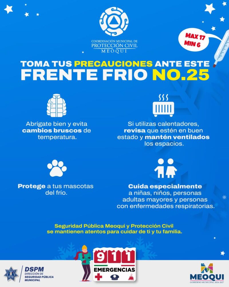 Ante la llegada del Frente Frío número 25, la Dirección de Seguridad Pública Municipal (DSPM) de Meoqui, a través de la Coordinación Municipal de Protección Civil y Bomberos, emitió una serie de recomendaciones preventivas para proteger la salud y seguridad de las familias, ya que se pronostican temperaturas mínimas de hasta 6 grados centígrados durante los próximos días en la región Centro-Sur del estado.