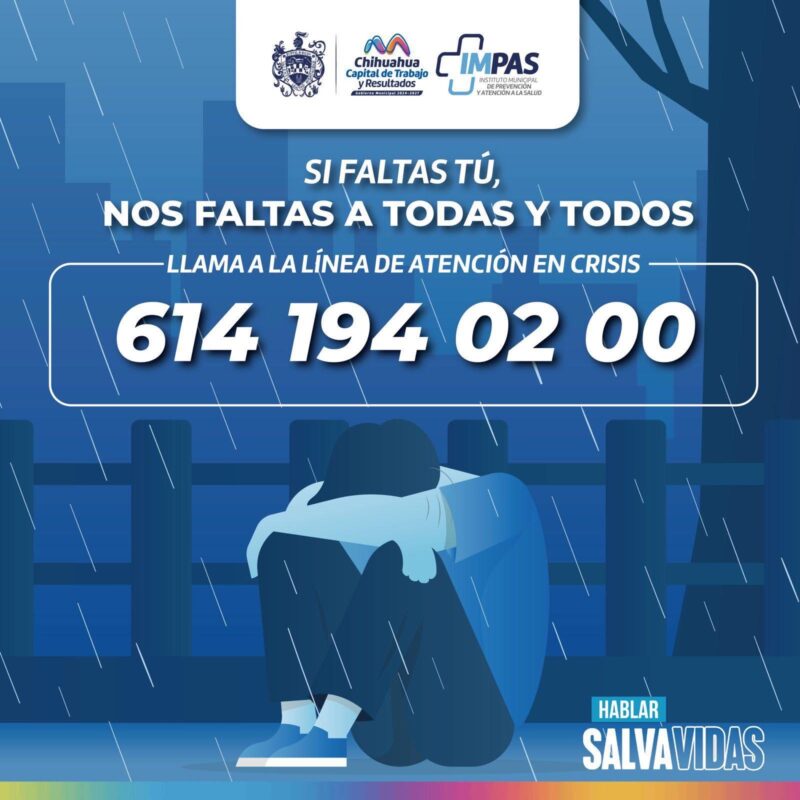 H. Ciudad de Chihuahua, Chih., a 12 de noviembre de 2025.- El Gobierno Municipal de Chihuahua, a través del Instituto Municipal de Prevención y Atención a la Salud (IMPAS), recuerda a la ciudadanía que la Línea de Atención en Crisis está disponible las 24 horas del día, los siete días de la semana, para brindar apoyo psicológico inmediato, orientación emocional y contención profesional a quienes enfrentan momentos de angustia, ansiedad, tristeza profunda o pensamientos de autolesión.