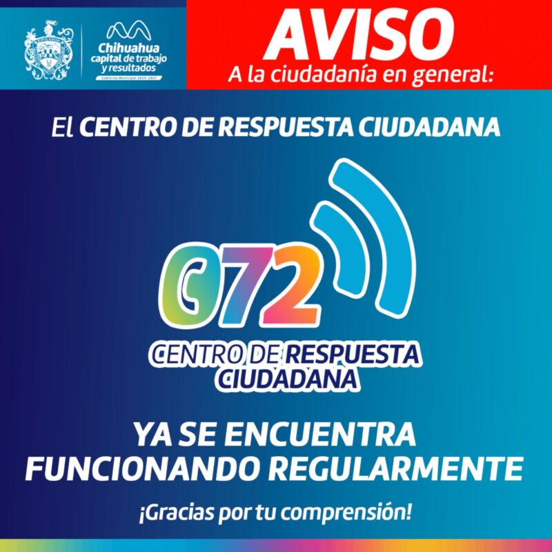 H. Ciudad de Chihuahua, Chih. A 8 de mayo de 2025.- El Gobierno Municipal informa que el número del conmutador del Centro de Respuesta Ciudadana (CRC) 072 y el sistema de cobro de las cajas de Tesorería ubicadas la Comandancia Norte, Parque Fundadores, Alsuper Nogales, Relleno Sanitario y Rastro TIF, quedó restablecido, al quedar restaurara la fibra óptica por parte del proveedor.