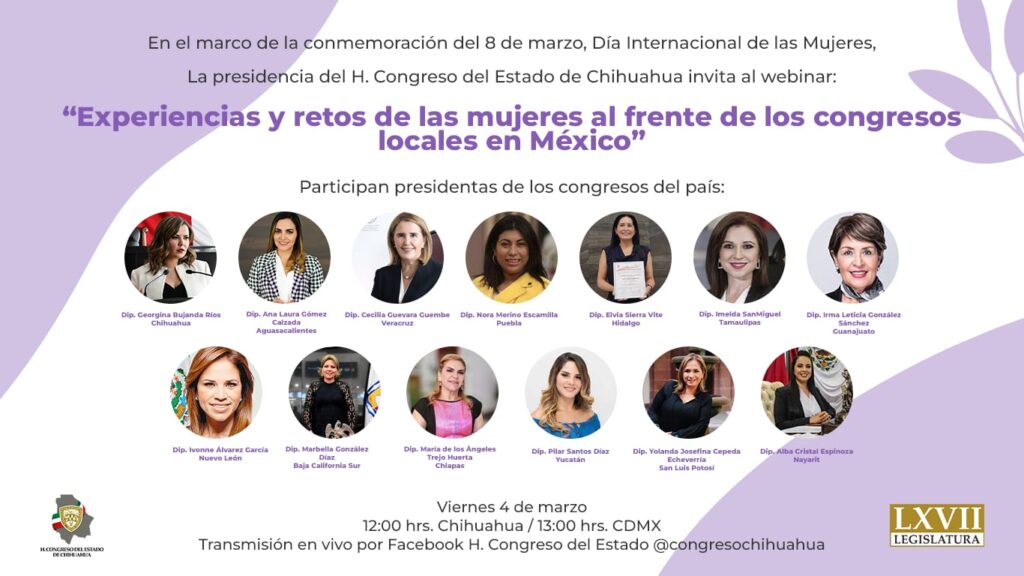 Con motivo de la conmemoración del 8 de marzo, Día Internacional de las Mujeres, Geo Bujanda, presidenta del Congreso del Estado invita al webinar “Experiencias y retos de las mujeres al frente de los congresos locales de México”, que reunirá al menos a 12 mujeres titulares de los poderes legislativos del país.