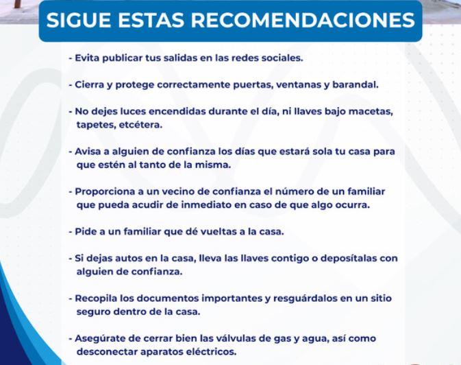 Con el fin de salvaguardar los bienes inmuebles de las familias chihuahuenses, el Gobierno Municipal a través de la Dirección de Seguridad Pública, emite las siguientes recomendaciones, que serán de gran utilidad para quienes salen de vacaciones durante esta temporada navideña.