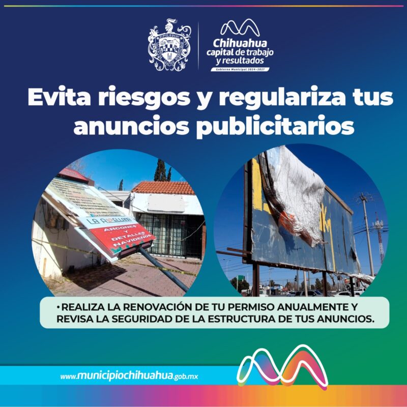 H. Ciudad de Chihuahua, Chih., a 10 de febrero de 2026.- Ya que se acerca la temporada de fuertes vientos del año, el Gobierno Municipal, exhorta a regularizar los anuncios publicitarios y seguir las recomendaciones para evitar accidentes que pongar en riesgo la seguridad de las familias.