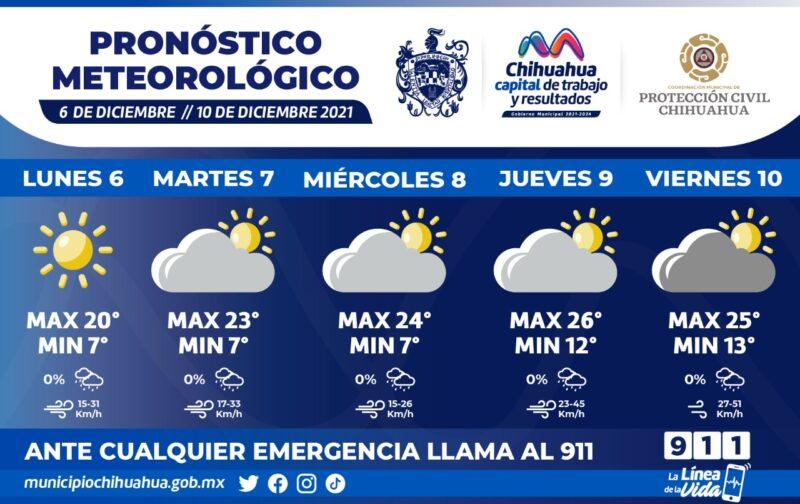 Joel Estrada Castillo, encargado del despacho de la dependencia municipal que este lunes se presentará soleado y a partir del martes habrá presencia de nublados, con temperatura máxima de 20°C; el martes la máxima será de 23°C y la mínima de 7°C; para miércoles y jueves las temperaturas máximas rondarán los 24°C y 26°C, y las mínimas de 7°C y 12°C, respectivamente; finalmente el viernes el termómetro subirá a los 25°C y bajará a los 13°C.