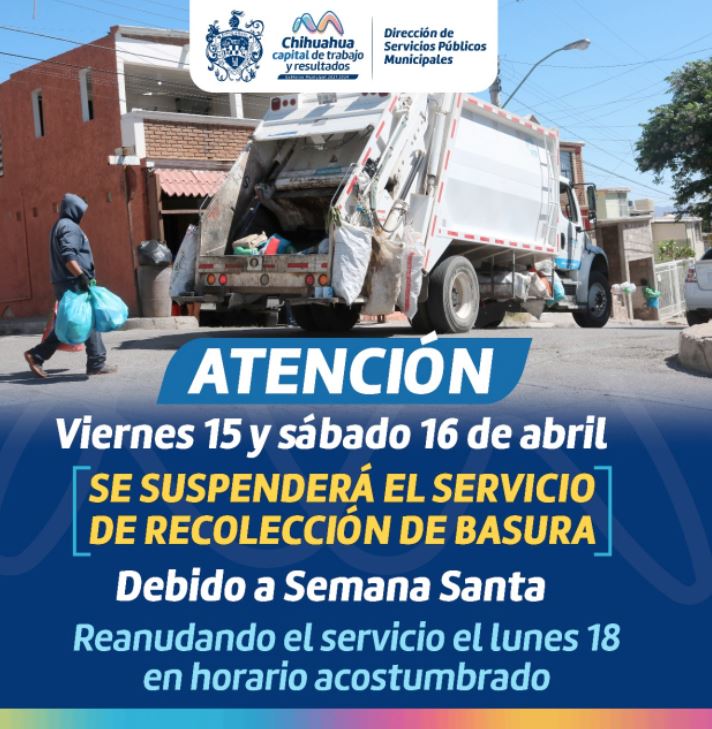 Con motivo de los días inhábiles por la celebración de semana santa, el Gobierno Municipal, a través de la Dirección de Servicios Públicos Municipales, informa a la ciudadanía que los días viernes 15 y sábado 16 de abril se suspenderá el servicio de recolección de basura habitacional.