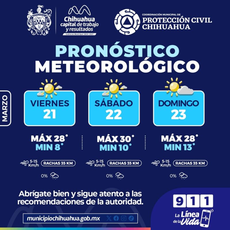 Chihuahua, Chih. A 21 de marzo del 2025.- La Coordinación Municipal de Protección Civil, informa que este fin de semana, del 21 al 23 de marzo, se prevén temperaturas máximas de 30°C y mínimas de 8°C.