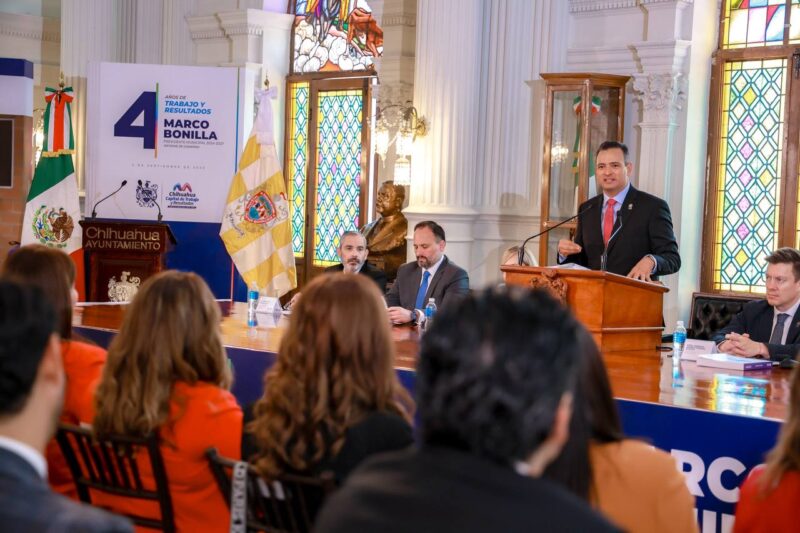 H. Ciudad de Chihuahua, Chih. A 4 de septiembre de 2025.- En sesión solemne de Cabildo, el alcalde Marco Bonilla hizo entrega a las y los regidores del Ayuntamiento de Chihuahua el documento de su Cuarto Informe, donde resaltó que los resultados presentados son el testimonio de lo que se puede lograr cuando el gobierno, la ciudadanía y las instituciones trabajan como aliados, no como adversarios.