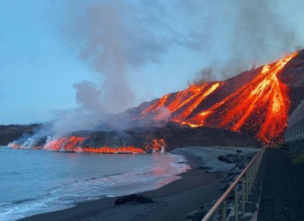 La corriente de roca fundida del volcán Cumbre Vieja, que entró en erupción a mediados de septiembre, llegó al agua cerca del popular lugar de surf de la playa de Los Guirres poco antes de las 2 de la madrugada, según el Ministerio de Transportes.