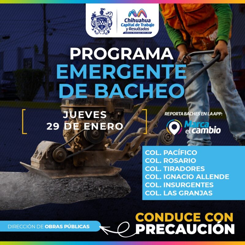 H. Ciudad de Chihuahua, Chih., a 29 de enero del 2026.- El Gobierno Municipal, a través de la Dirección de Obras Públicas, realizará trabajos de bacheo este jueves 29 de enero mediante el programa emergente en calles de las colonias: Pacífico, Rosario, Tiradores, Ignacio Allende, Insurgentes y Las Granjas.