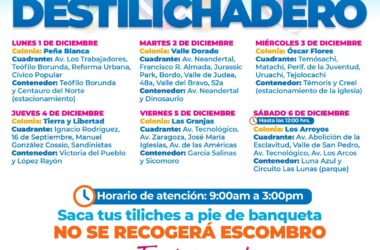 H. Ciudad de Chihuahua, Chih., a 1 de diciembre del 2025.- El Gobierno Municipal, a través de la Dirección de Obras Públicas, realizará trabajos de bacheo este lunes 1 de diciembre, mediante el programa emergente en calles de las colonias: Vistas del Norte, Riberas de Sacramento, Las Galeras, Los Girasoles y Burócrata Federal, así como en la avenida Universidad.