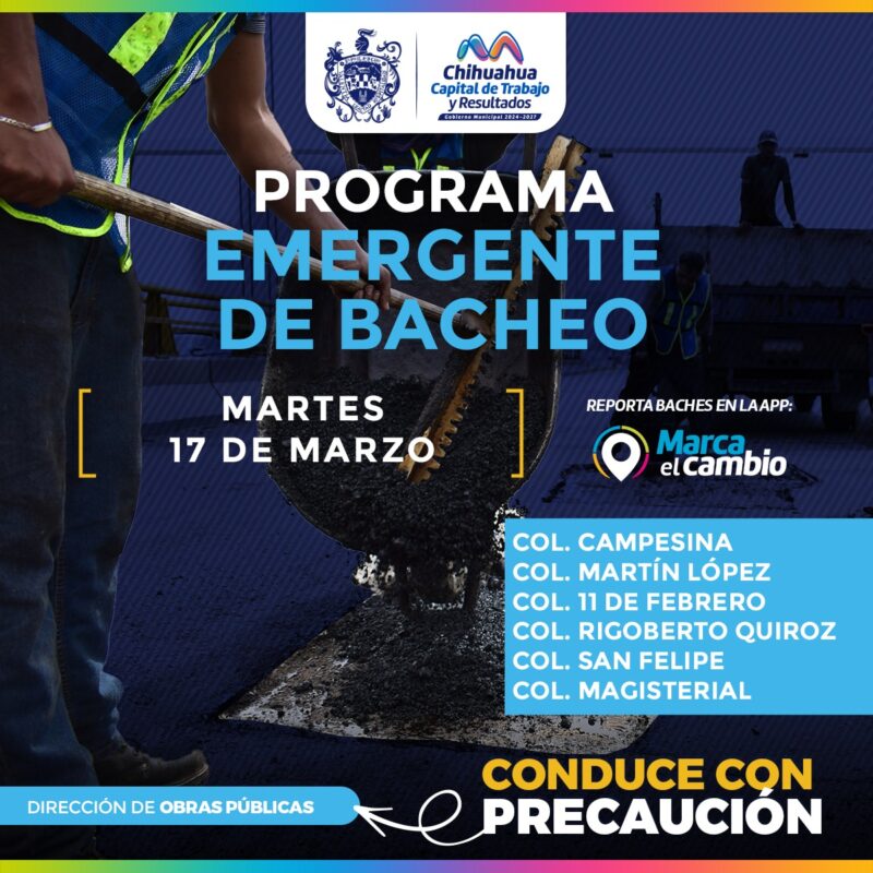 H. Ciudad de Chihuahua, Chih., a 17 de marzo de 2026.- El Gobierno Municipal, a través de la Dirección de Obras Públicas, realizará trabajos de bacheo este martes 17 de marzo mediante el programa emergente en las calles de las colonias: Campesina, Martín López, 11 de Febrero, Rigoberto Quiroz, San Felipe y Magisterial.