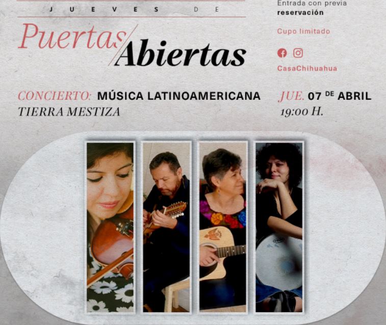 La agrupación musical Tierra Mestiza se presentará este jueves 7 de abril a las 19:00 horas en Casa Chihuahua Centro de Patrimonio Cultural, como parte de las actividades del programa permanente “Jueves de Puertas Abiertas”.