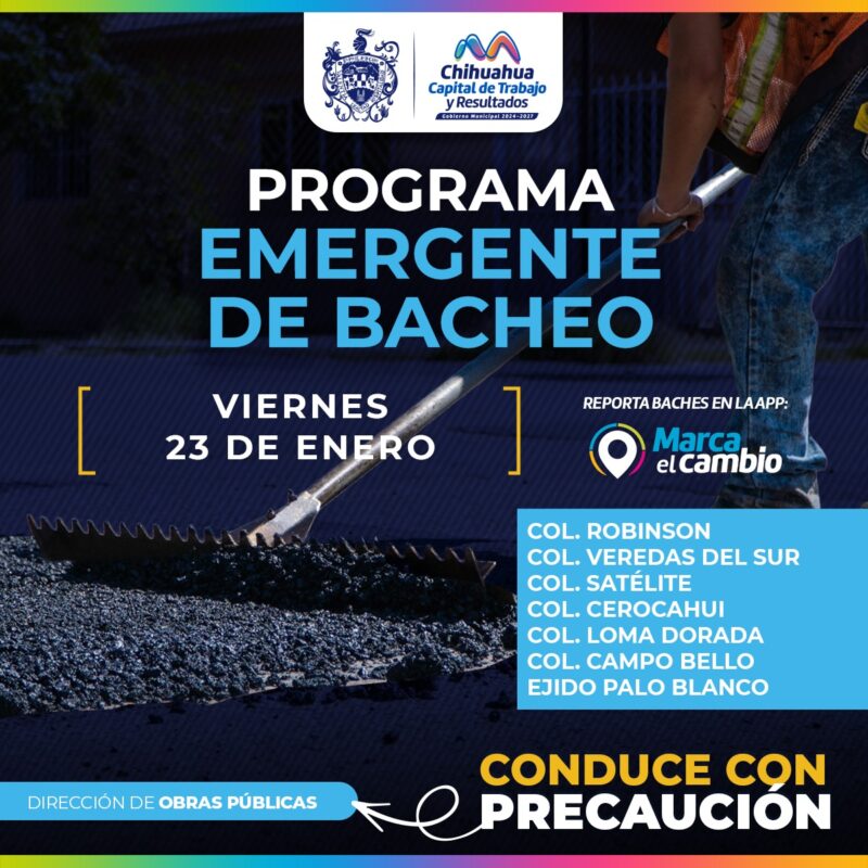 H. Ciudad de Chihuahua, Chih., a 23 de enero del 2026.- El Gobierno Municipal, a través de la Dirección de Obras Públicas, realizará trabajos de bacheo este viernes 23 de enero mediante el programa emergente en calles de las colonias: Robinson, Veredas del Sur, Satélite, Cerocahui, Loma Dorada y Campo Bello, así como en el Ejido Palo Blanco.