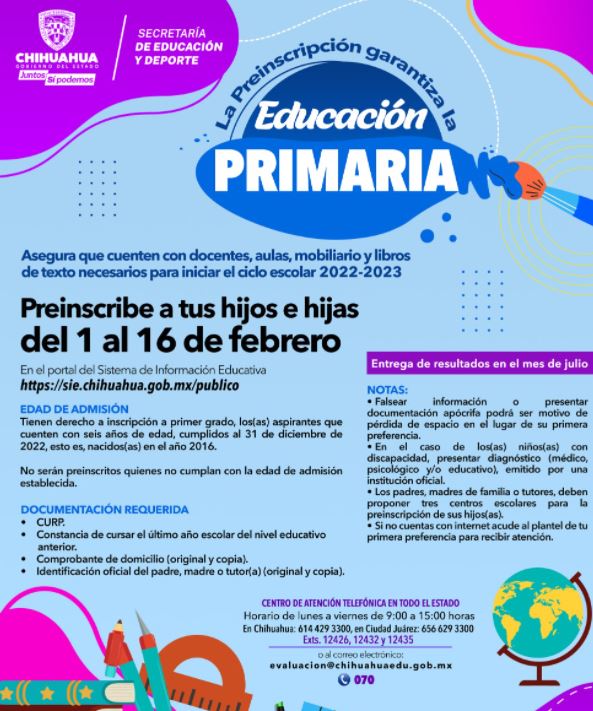 1. Ingresar a la plataforma del Sistema de Información Educativa (SIE): https://sie.chihuahua.gob.mx/publico/preinscripciones, que estará habilitada a partir del 1 de febrero y tendrá como fecha límite el 16 de febrero.