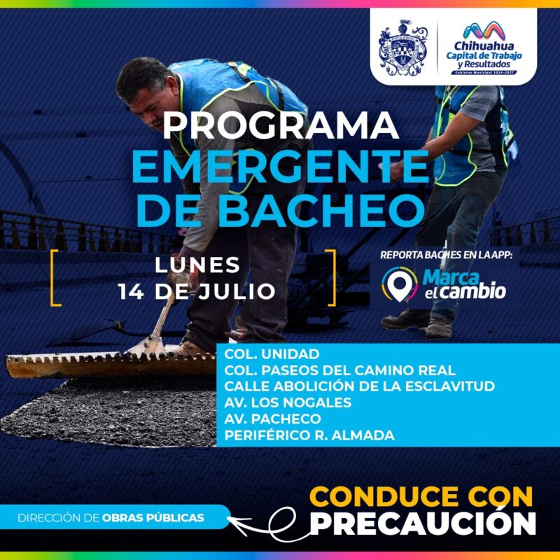 H. Ciudad de Chihuahua, Chih., a 14 de julio del 2025.- El Gobierno Municipal a través de la Dirección de Obras Públicas realizará trabajos de bacheo mediante el programa emergente en las colonias Paseos del Camino Real, Unidad, así como en la calle Abolición de la Esclavitud, las avenidas Nogales y Pacheco y en el periférico R. Almada.