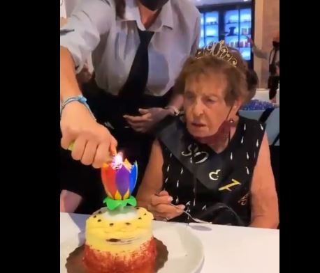 La señora se encuentra en un restaurante festejando un año más de vida, por lo que justo enfrente de ella podemos ver un pastel, cuya vela es encendida por un mesero.
