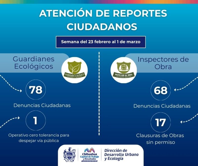 H. Ciudad de Chihuahua, Chih., a 2 de marzo de 2026.- El Gobierno Municipal, a través de la Dirección de Desarrollo Urbano y Ecología, presenta las actividades realizadas del 23 de febrero al 1 de marzo, como parte del compromiso con el orden, la legalidad y el cuidado del entorno.