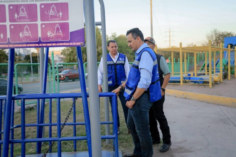 H. Ciudad de Chihuahua, Chih., a 6 de noviembre de 2025.– Con el propósito de garantizar que las familias chihuahuenses cuenten con espacios públicos limpios, seguros y en óptimas condiciones, el alcalde Marco Bonilla realizó un recorrido de supervisión por los parques Aventura, ubicado en la avenida La Cantera, y El Palomar.