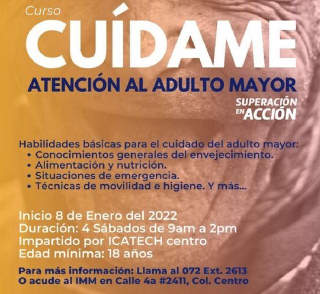 El Gobierno Municipal a través del Instituto Municipal de las Mujeres (IMM) te invita a capacitarte en el curso “Cuídame, atención al adulto mayor” impartido por el programa Superación en Acción, en colaboración con el ICATECH.