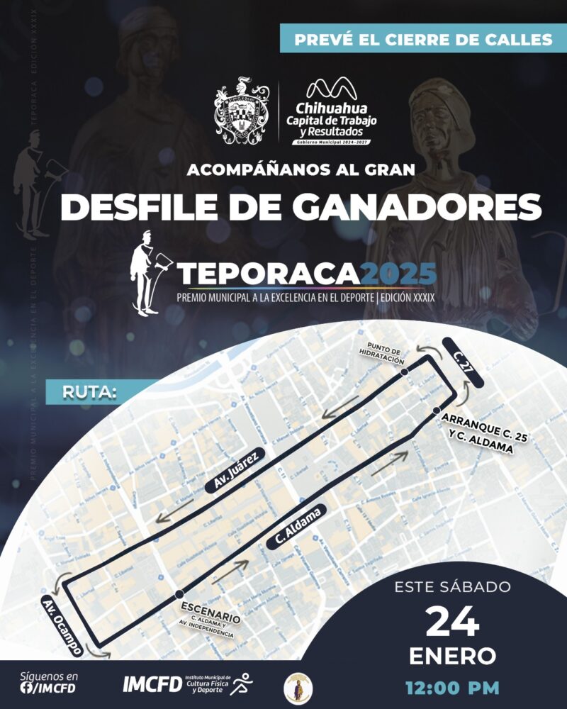 H. Ciudad de Chihuahua, Chih., a 21 de enero de 2026.- El Gobierno Municipal anuncia el cierre de calles del Centro de la ciudad por el tradicional desfile de los deportistas ganadores del Premio Municipal a la Excelencia en el Deporte, “Teporaca”, este sábado 24 de enero a las 12:00 horas.