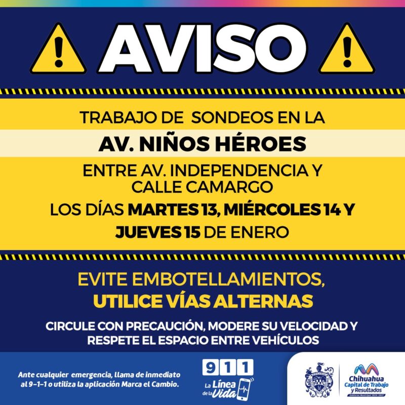 Ciudad de Chihuahua, Chih., a 10 de enero de 2025.- Se informa que a partir del martes martes 13 al jueves 16 de enero, el Fideicomiso del Centro Histórico llevará a cabo trabajos de sondeo sobre la avenida Niños Héroes, entre avenida Independencia y calle Camargo, por lo que se hace un atento llamado a la ciudadanía para tomar precauciones al transitar por la zona.