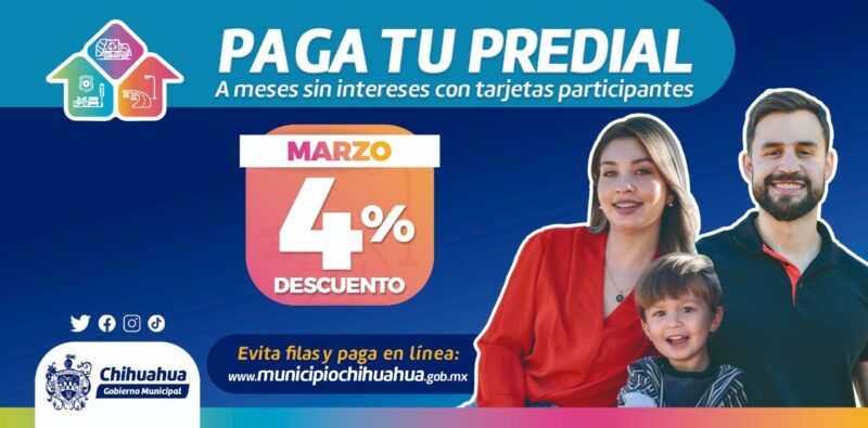Podrás pagar a través de la página del Municipio: http://www.municipiochihuahua.gob.mx/, sin salir de casa, o si deseas acudir a pagar de manera presencial puede hacerlo en las cajas receptoras del Gobierno Municipal con las tarjetas de crédito Banamex, Santander, Scotiabank y BBVA a 6 meses sin intereses.