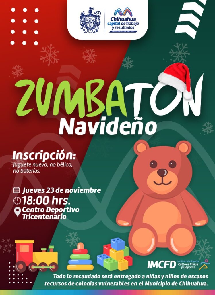 El Instituto Municipal de Cultura Física y Deporte (IMCFD), invita a la población en general a participar en el “Zumbatón Navideño”, con la donación de un juguete como boleto de acceso.