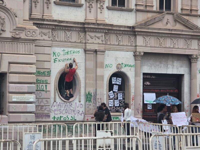 Ante estos hechos, el Gobierno Municipal manifiesta de manera categórica lo siguiente: “como gobierno condenamos la crueldad y el maltrato hacia los animales y no lo toleramos, pero condenamos la vandalización de elementos del patrimonio histórico de las y los chihuahuenses, y más aún cuando el municipio, nada tienen que ver, ni ha otorgado permiso alguno para los actos que generaron la protesta.”
